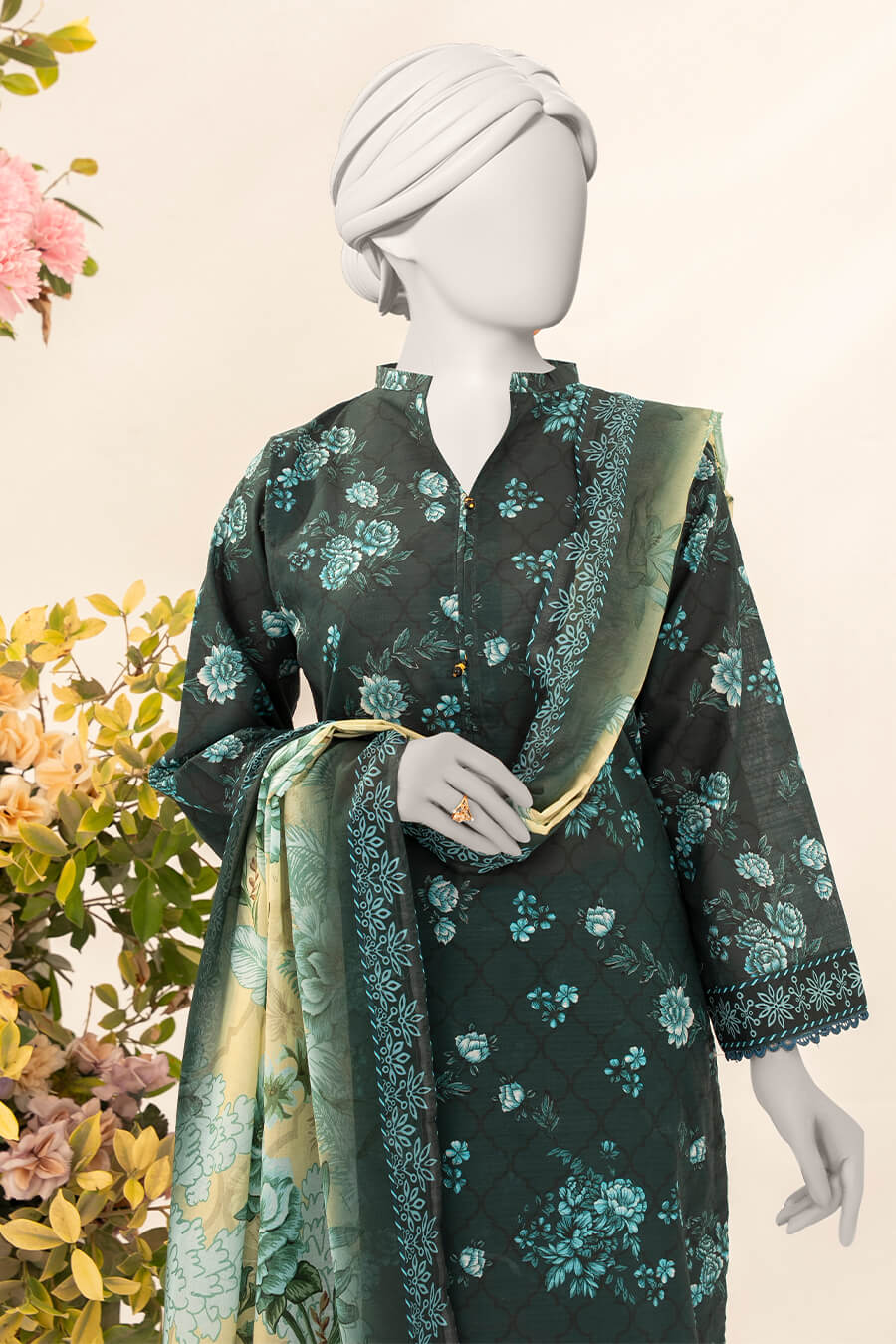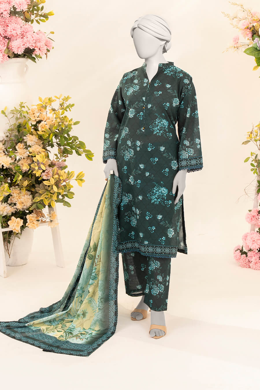 A deep bottle green shade symbolizing richness and depth. Designed on premium Doriya luxury lawn.