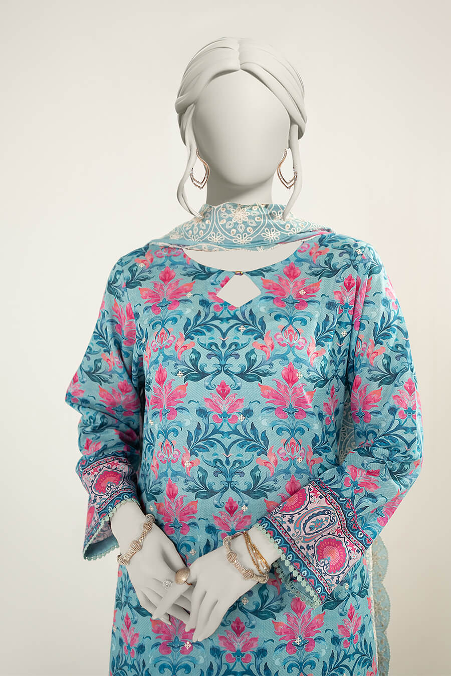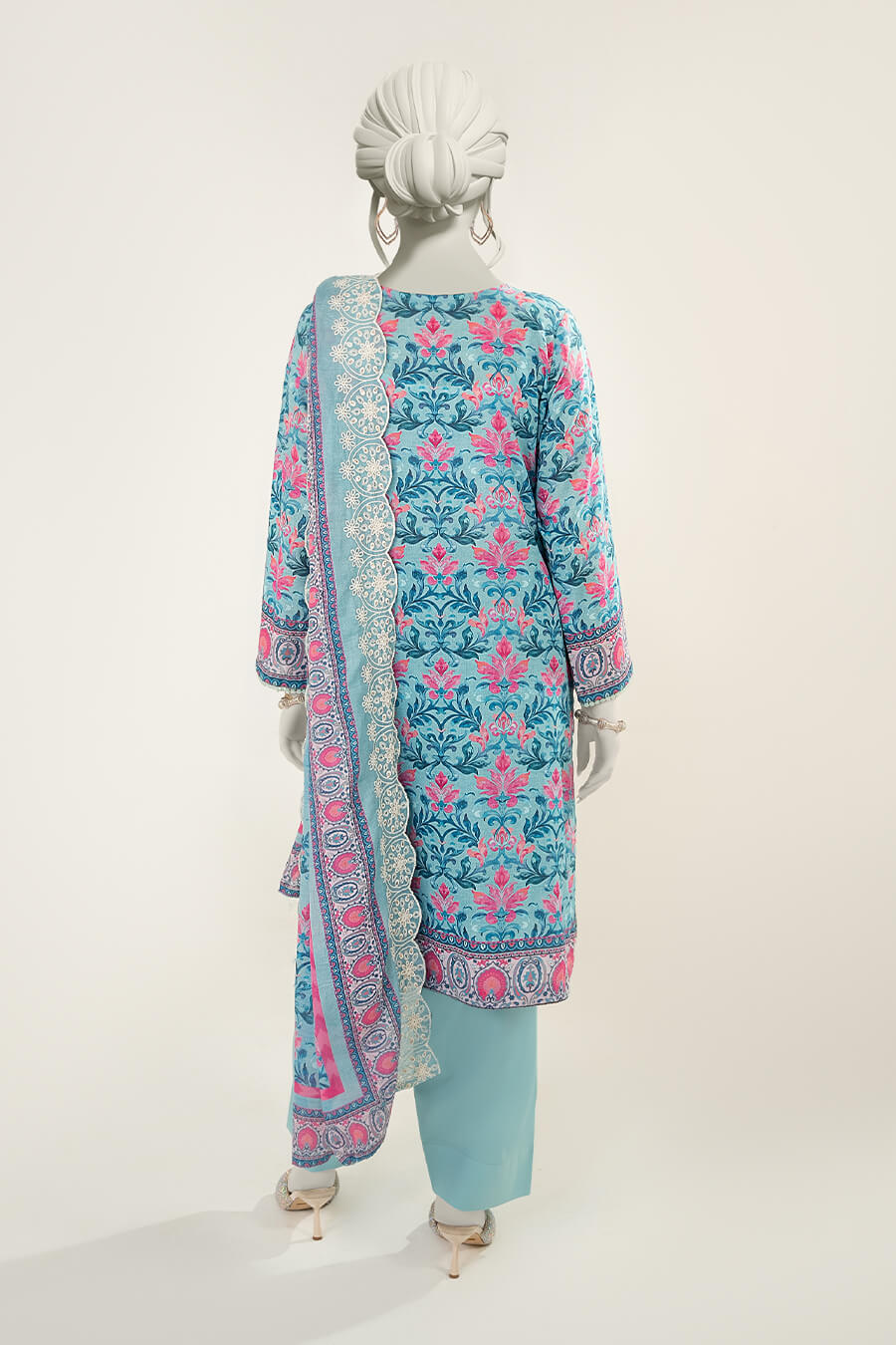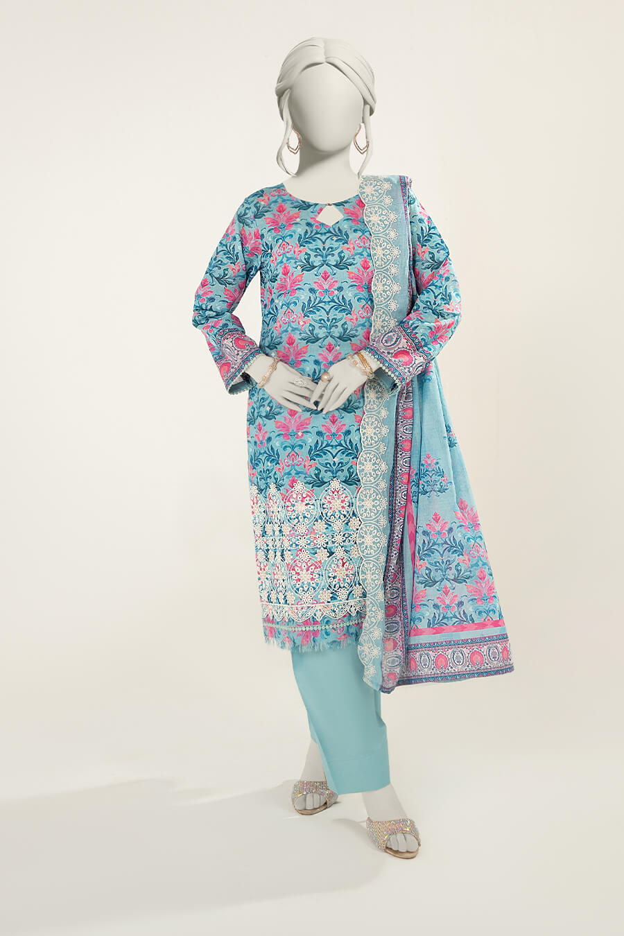 A fresh firozi blue unstitched lawn ensemble highlighted with elegant embroidery and a delicate cutwork dupatta.