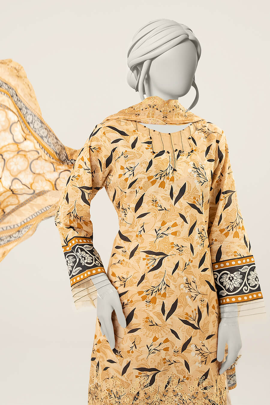 A warm ochre yellow unstitched lawn suit enhanced with elegant embroidery and a finely cutwork dupatta.