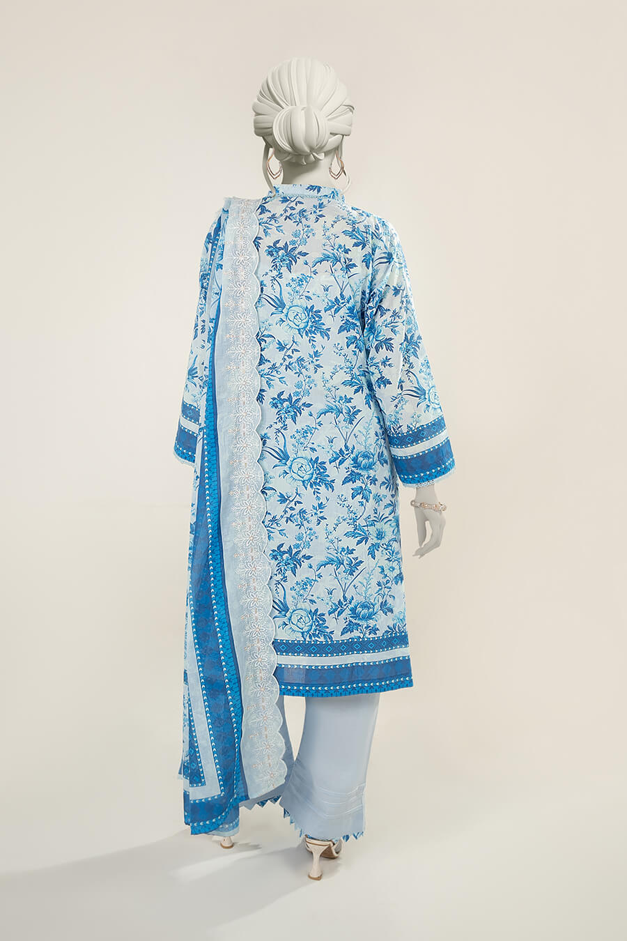 A soothing ice blue unstitched lawn design featuring refined embroidery and an elegant cutwork dupatta.