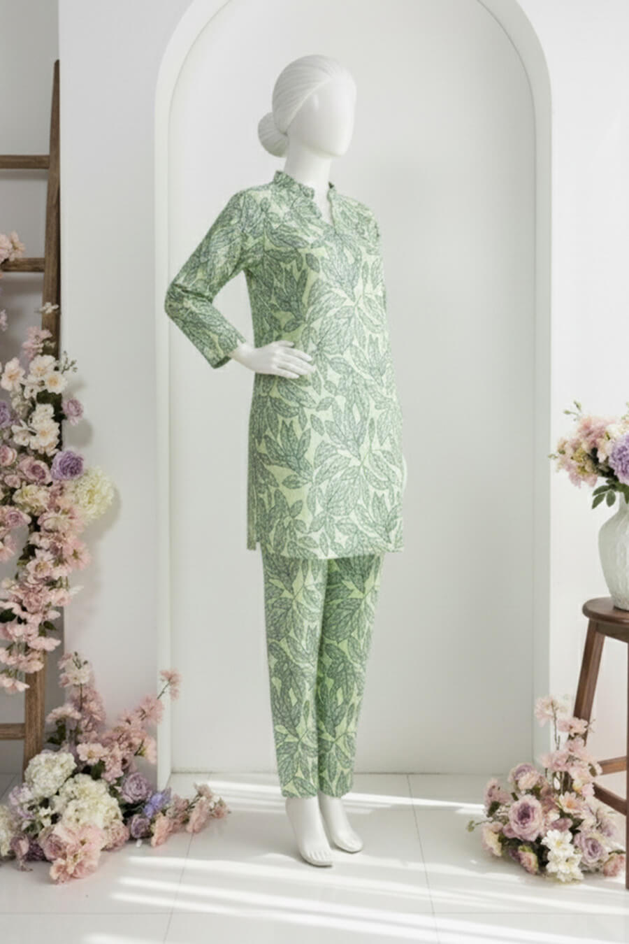 A soft mint green outfit with breezy charm. Allover printed stitched 2-piece in premium lawn. Light, fresh, and stylish.