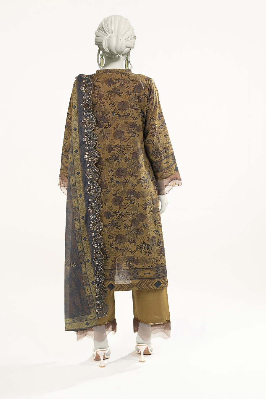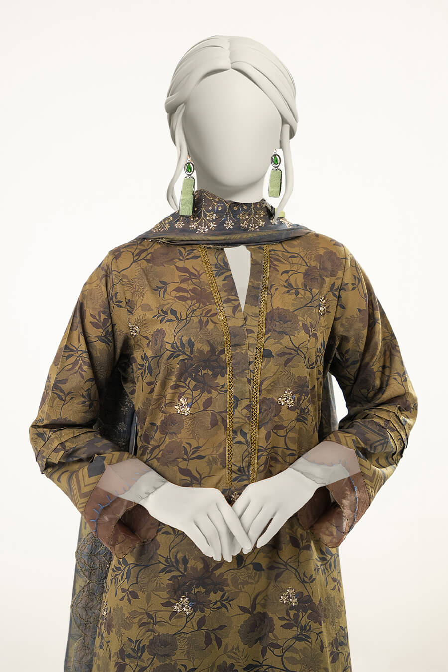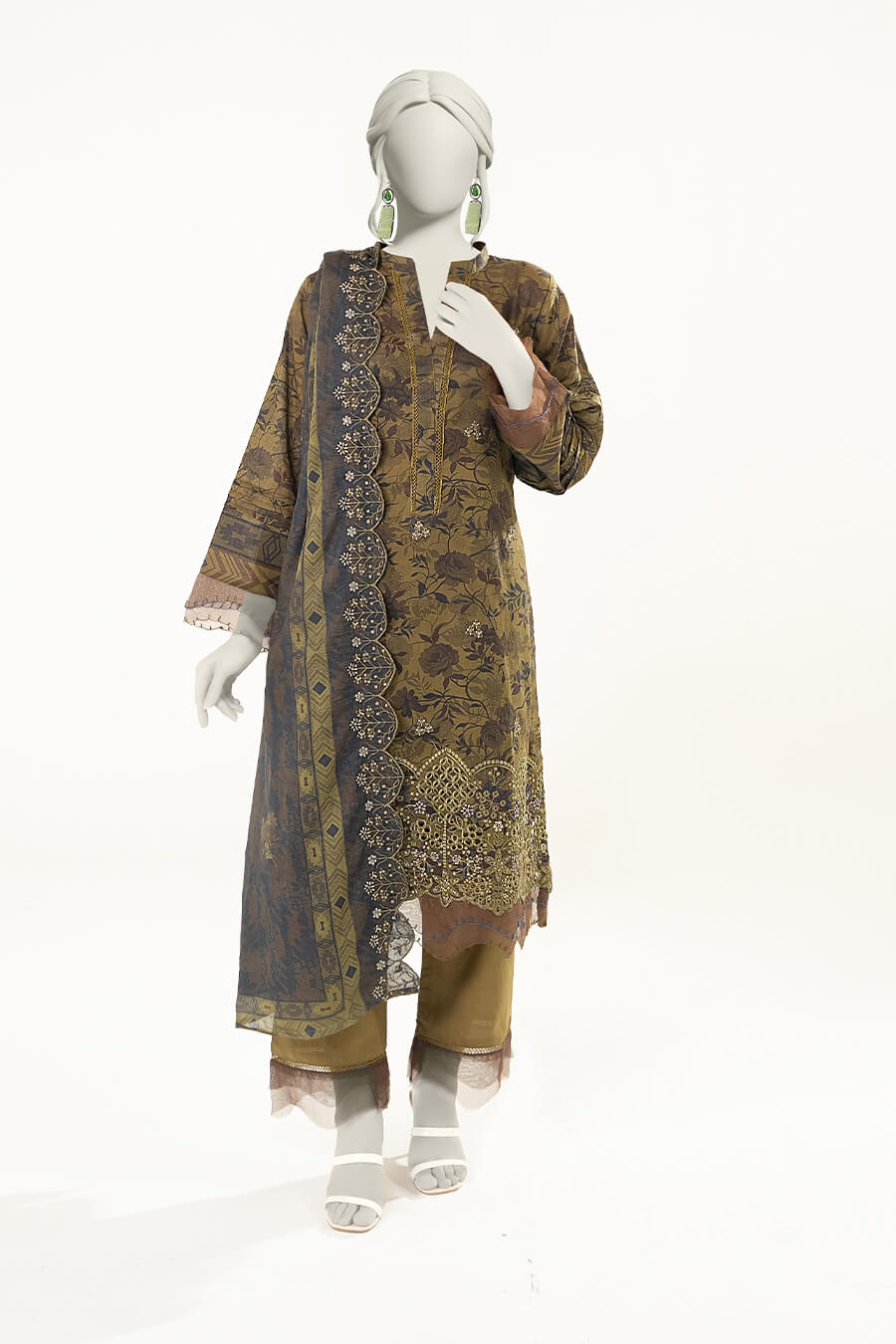 A refined olive green unstitched lawn suit featuring elegant neck embroidery and a delicately cutwork embroidered dupatta. Perfect for graceful everyday wear.