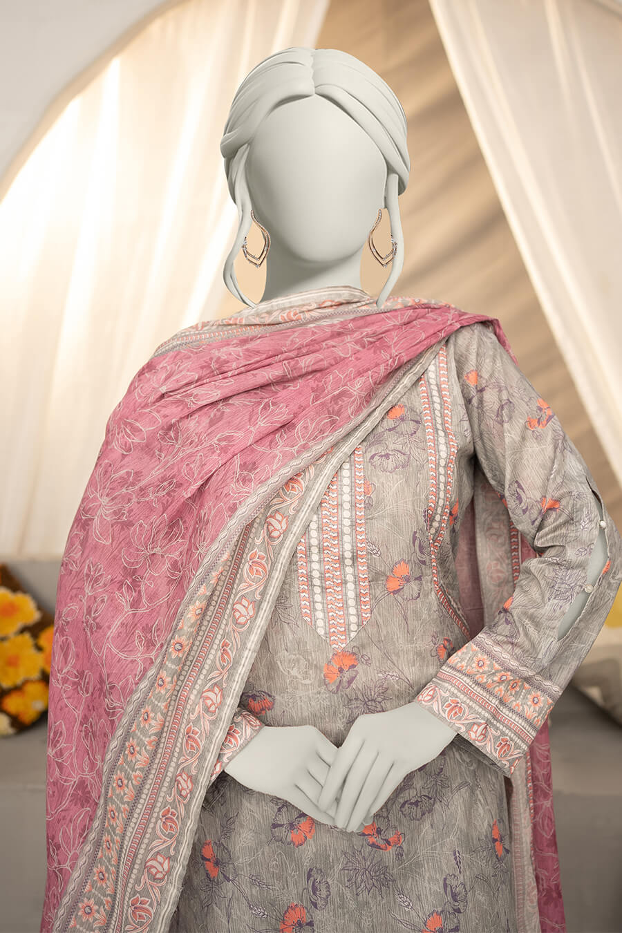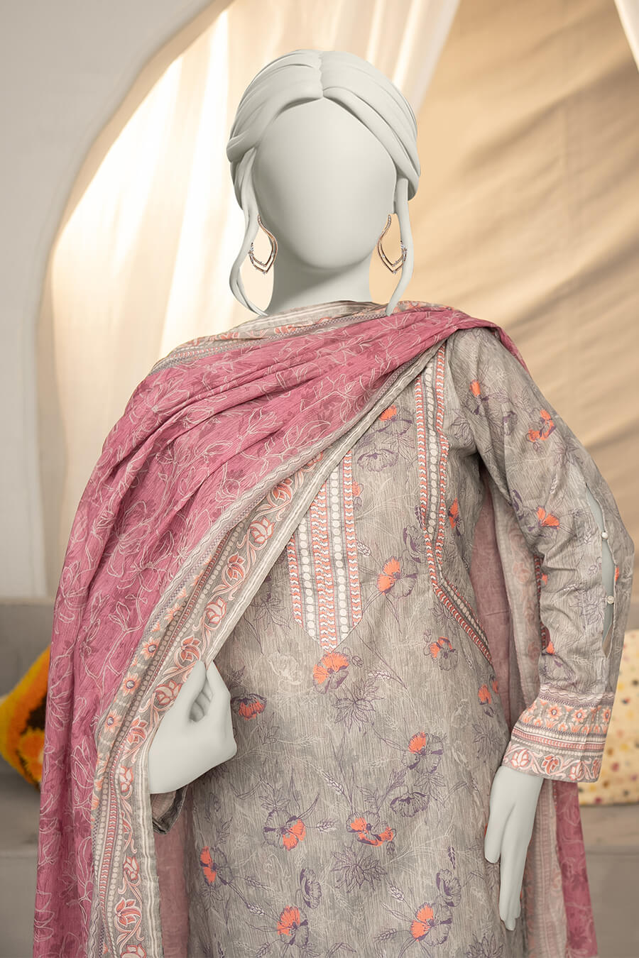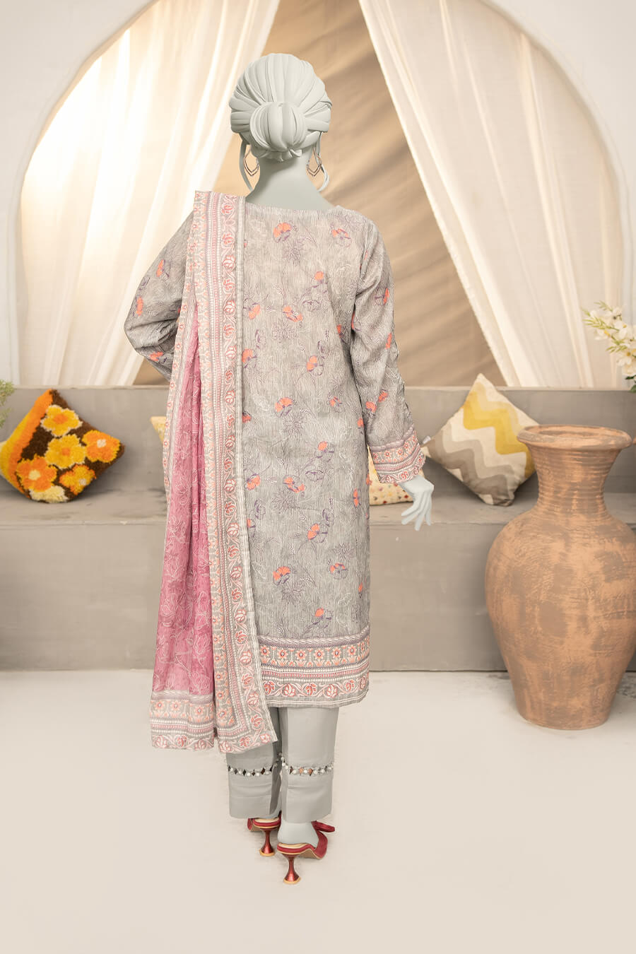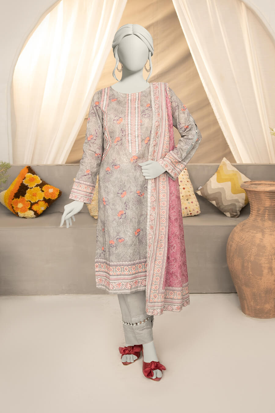 A light grey digital printed lawn suit offering subtle elegance and breathable comfort.