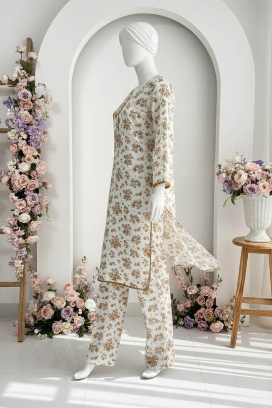 A clean off-white design with a serene aesthetic. Allover print paired with a same-tone stitched trouser. A must-have classic.