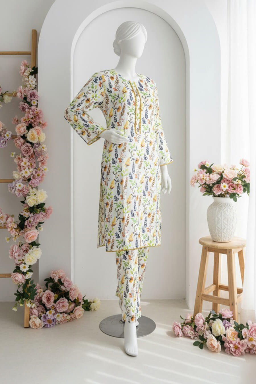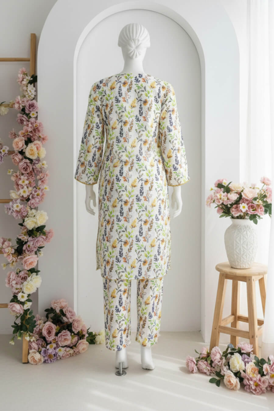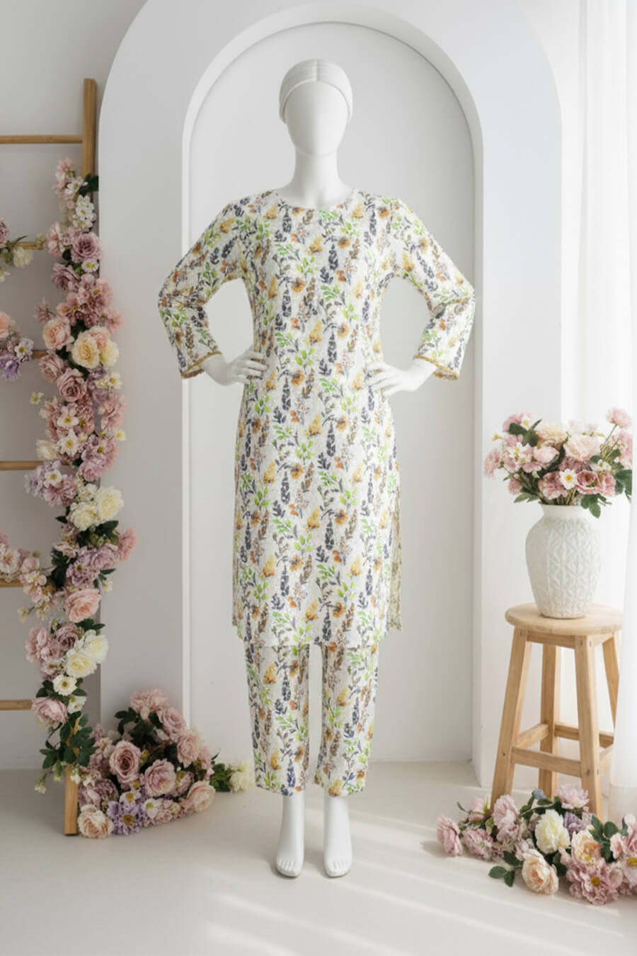 A soft white variant with subtle design variations. Allover printed stitched 2-piece in premium fabric. Elegant and serene.