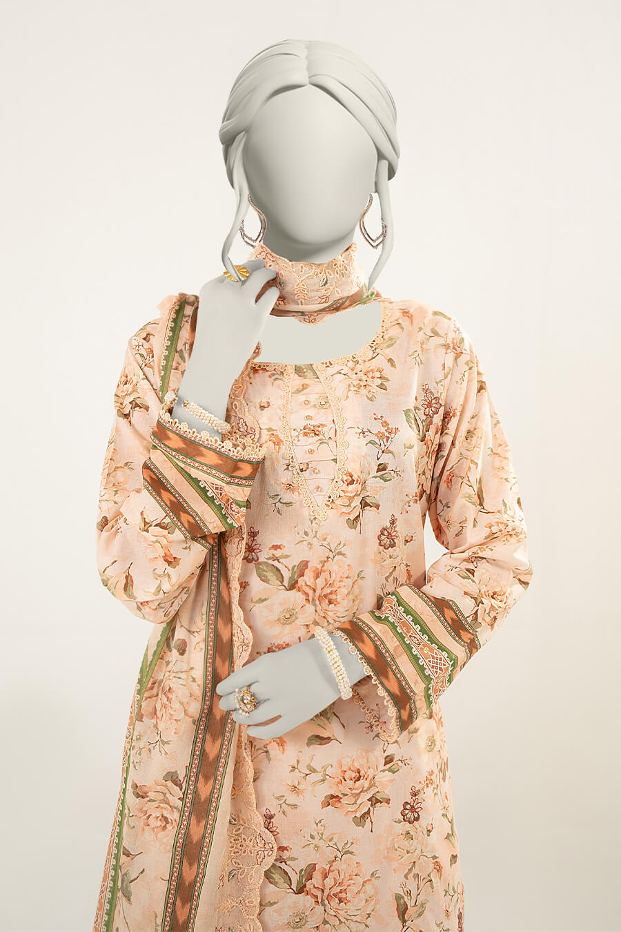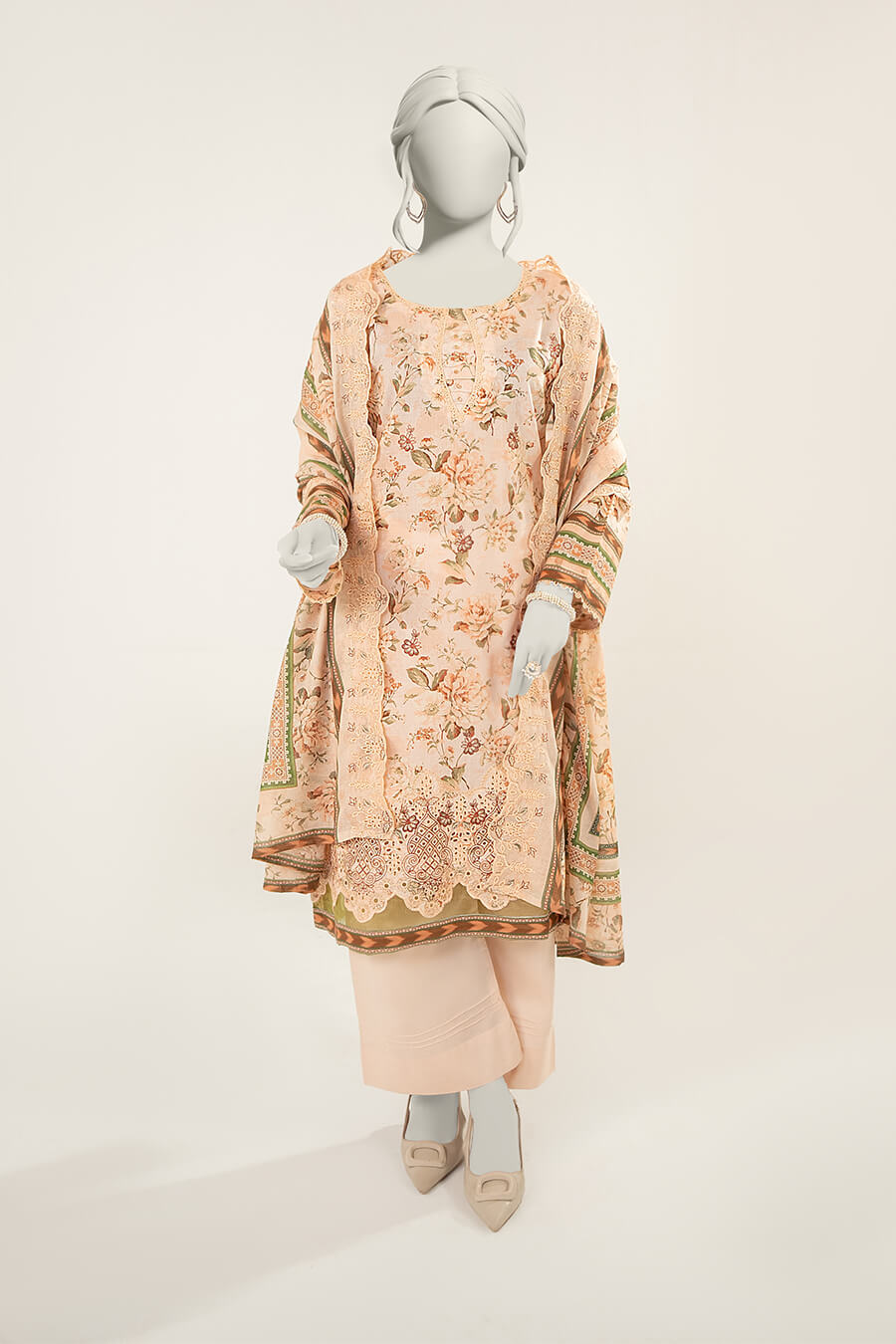 A delicate soft peach unstitched lawn suit with graceful embroidery and an elegant cutwork dupatta.